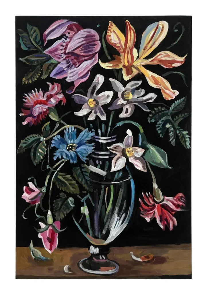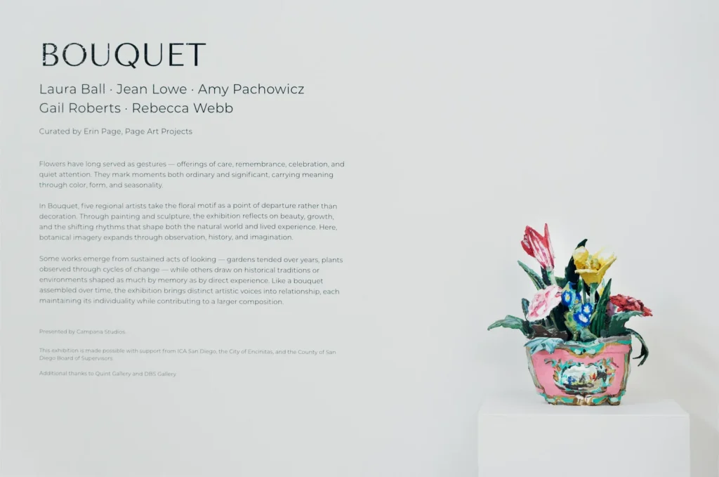 Bouquet is a curated exhibition organized by Page Art Projects and presented as a project of Campana Studios. On view at the ICA North Pavilion in Encinitas, the exhibition brings together five regional artists working across painting and sculpture whose practices engage botanical imagery through observation, history, and imagination.